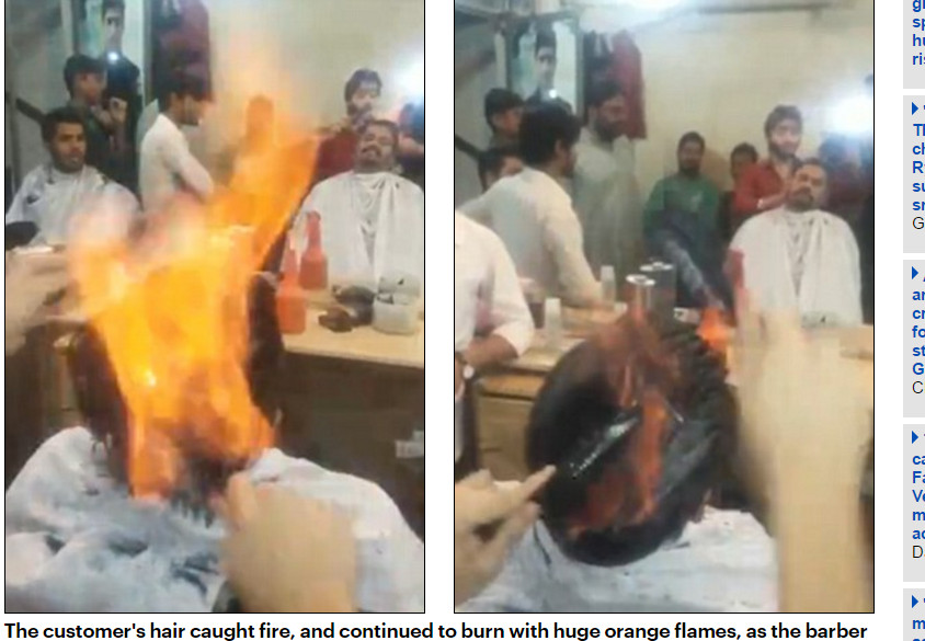 巴基斯坦有一名神乎其技的理髮師,真的用火焰幫客人「燙」頭髮。這名理髮師先在客人的頭髮上抹上乳霜和不明藥劑,接著用打火機點燃他的頭,理髮師不慌不忙,用扁梳不斷梳整頭髮直到火焰熄滅,客人的頭髮還真的「燙直」了不少。