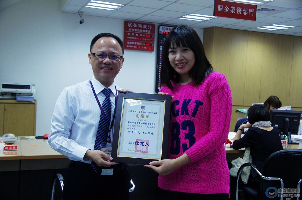 ▲華南銀行陳姓行員熱心助人,女警石捷親自致謝。(圖/警方提供)