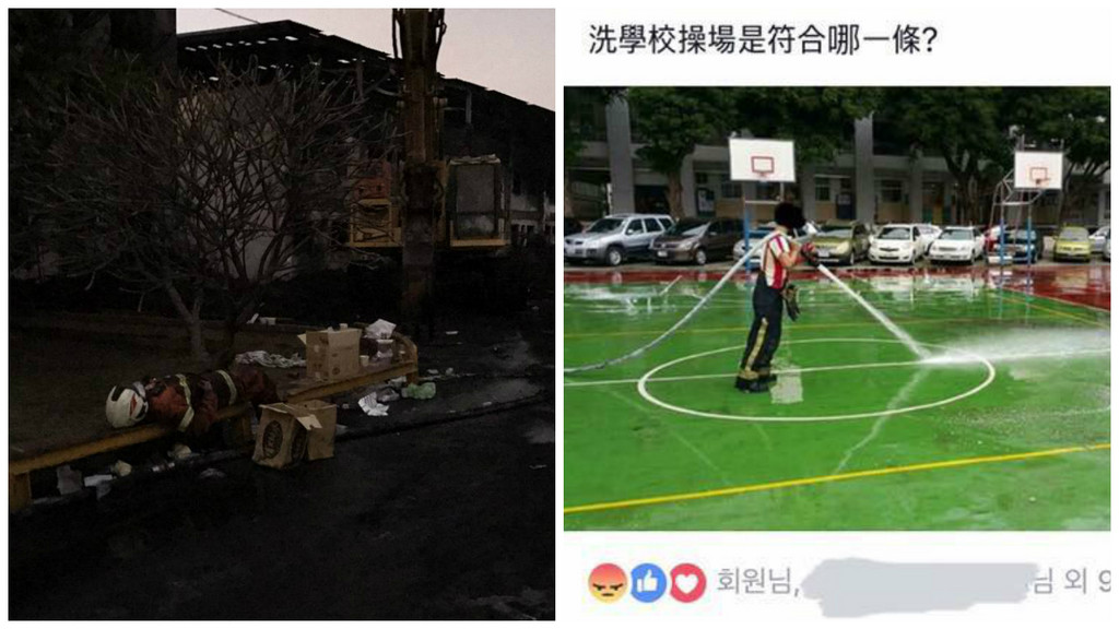 PO文的網友說,在火場拼死拼活煎熬這麼久,學長姐們身心都很疲憊,但忙完昨天的大火,不知道是學校跟指揮中心要求、還是什麼原因,今天派去洗學校籃球場,「讀那麼多書受那麼多訓練是用來幫學校洗地板? 把專業放在對的事情很難嗎? 」還引用《消防法》,「預防火災、搶救災害、緊急救護,洗學校操場是符合哪一條? 」