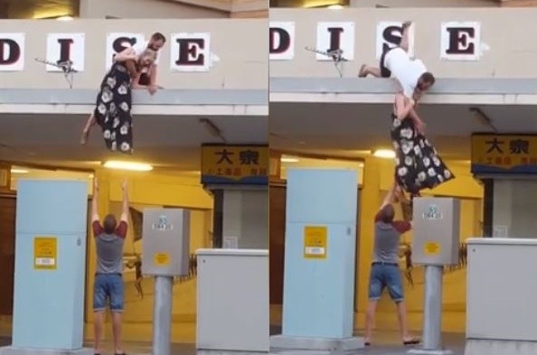 影片中,可以看到一名穿著白色上衣的男子,右手臂勾住了一位懸在半空中的金髮女子,疑似是要用「人體垂降」的概念,把人送到一樓,不過,兩人可能因為姿勢不對,導致上不去也下不來,呈現出僵持狀態,另一名男子則是張開雙臂在一樓,打算要接下女子,正當要碰到時,沒想到,二樓的男子似乎是手鬆脫,加上地心引力的影響,連人帶包和女子一起重摔至一樓,屁股直接著地,滿臉痛苦的在地上不停打滾。