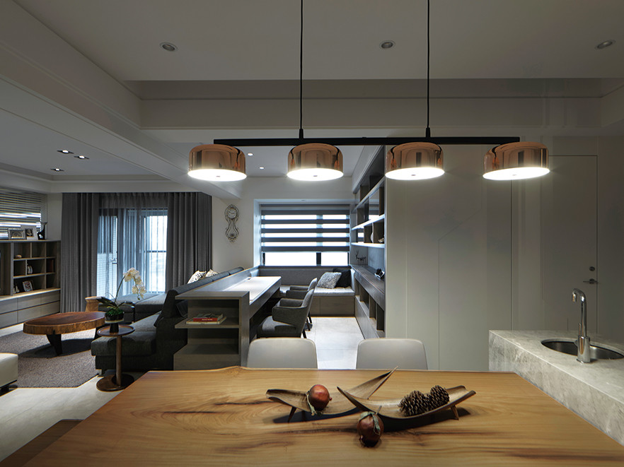 由於家庭成員簡單,盡可能將空間留給公領域使用,就成為此次規劃的一大重點。首先客廳沙發後方設置開放閱讀區,搭配窗邊臥榻、寬敞書桌與精美造型書櫃,都是迎合屋主平時作息的貼心設計,接著是情調優美的餐廚區,這裡也是親朋好友到訪時最愛駐留的交誼重心,質樸的原木長餐桌對話時髦的銅金燈飾,餐桌一側並銜接特製的大理石中島,除了檯面備有水槽外,後靠還有一座精緻酒櫃,彷彿隨時都能營造賓主盡歡的和樂氣氛。