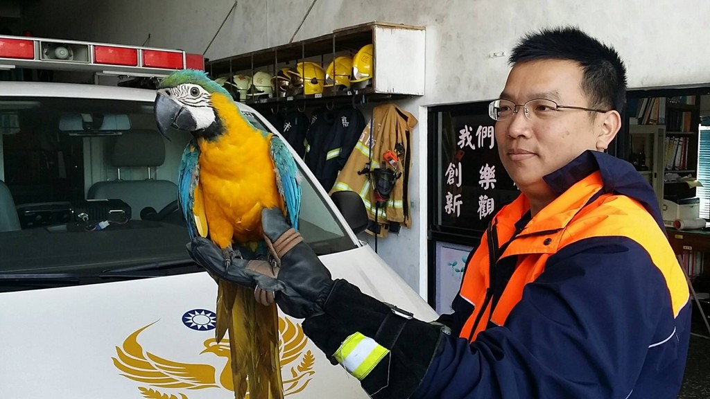 ▲天外飛來嬌客,金剛鸚鵡駐足校園。(圖/嘉義市消防局提供)
