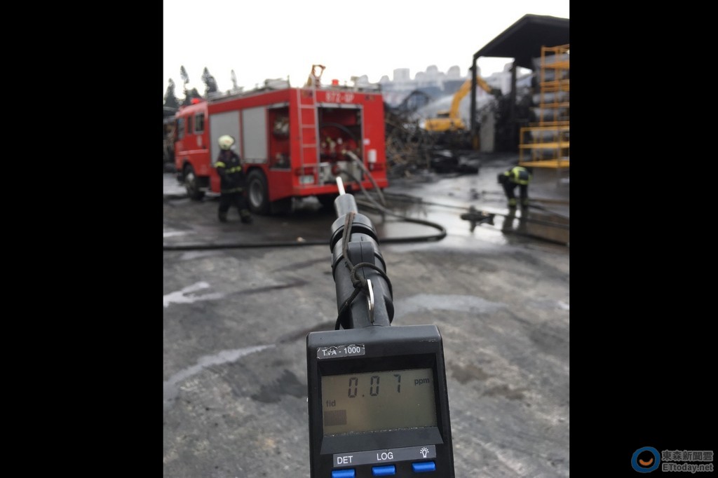 環保局指出,18日下午以火焰離子化偵測器(FID),檢測火災事故上風處的VOCs約0.3ppm,下風處約1.7ppm;對比於加油站的作業環境中,空氣裡的甲苯、二甲苯容許濃度標準是100ppm,目前濃度並不高。