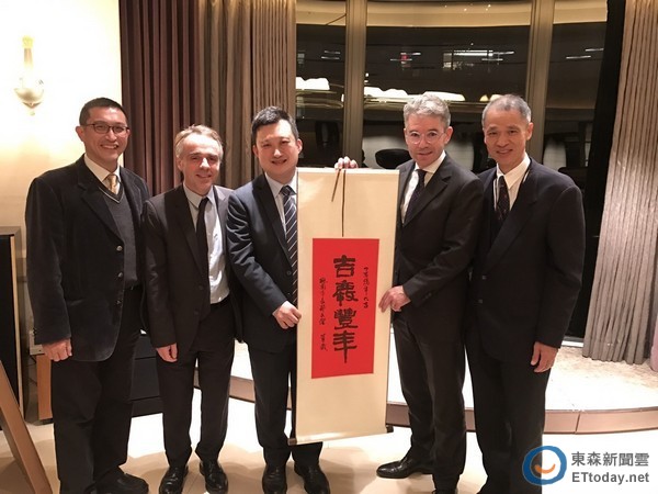 ▲顏子傑(右三)、郭承泉(右一)、朱松偉(左一)聯袂出席台法綠色能源交流晚宴,致贈「吉慶豐年」春聯。(圖/秘書處提供)