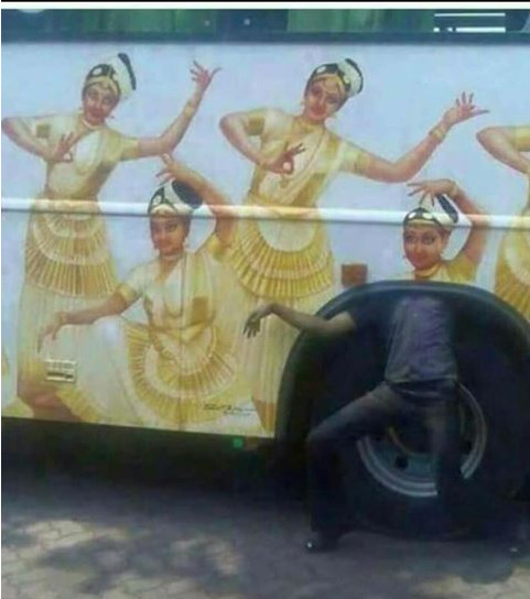 網友PO文表示,「靠X啦~人家在修車拉~~哈哈哈。」而附上的照片則是一個男士躲在公車後輪修車,但身形成現一個詭異的姿勢維持身體平衡,恰巧該輛公車的車身廣告是一群「跳舞女郎」手舞足蹈,瞬間看起來「完全無違和」。這張有趣的照片也隨即被轉貼到爆料公社粉絲團。