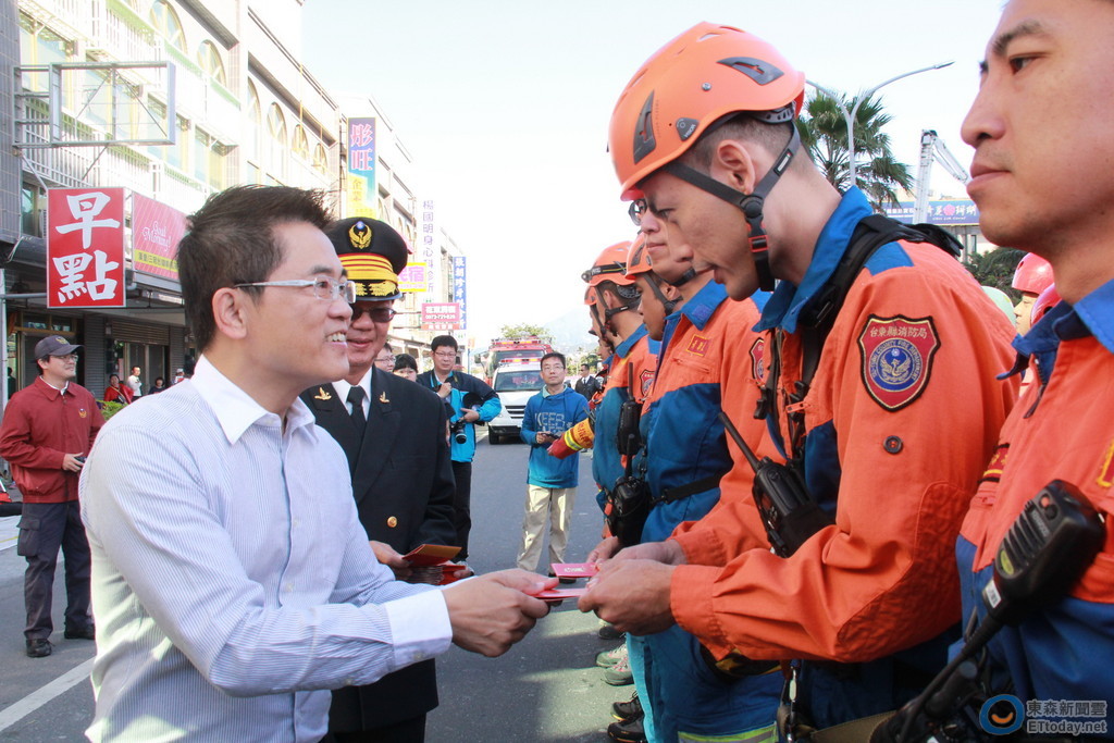 今年消防節慶祝活動,結合台東大隊106年春節期間加強火災搶救演練,由大隊暨所屬各分隊之消防義消人員、防火宣導隊、鳳凰志工以及台灣國際緊急救難總隊全員出動,在娜路彎大酒店展開驚心動魄的火災搶救演練,黃健庭除親臨現場觀看,並發給小紅包提前祝賀春節。