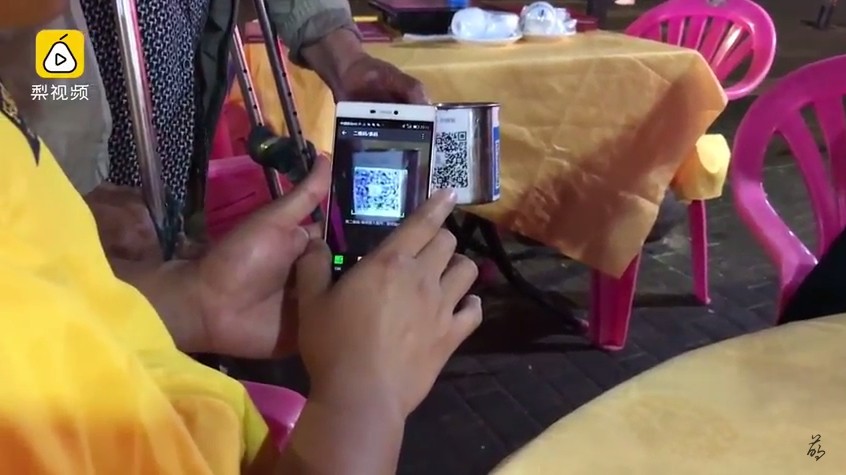 根據《梨視頻》,一名拄著拐杖的老爺爺走向小吃攤乞討,奇怪的是大家沒掏錢,反而是拿出手機。這不是在拍影片或直播,他們的手機全對著老爺爺用來乞討的水杯。「掃得到,肯定掃得到。」「你看你這多新穎,杯子上貼這個。」原來他們掃的是水杯上的QR Code,透過手機通訊軟體微信的支付系統,將愛心捐給老爺爺。