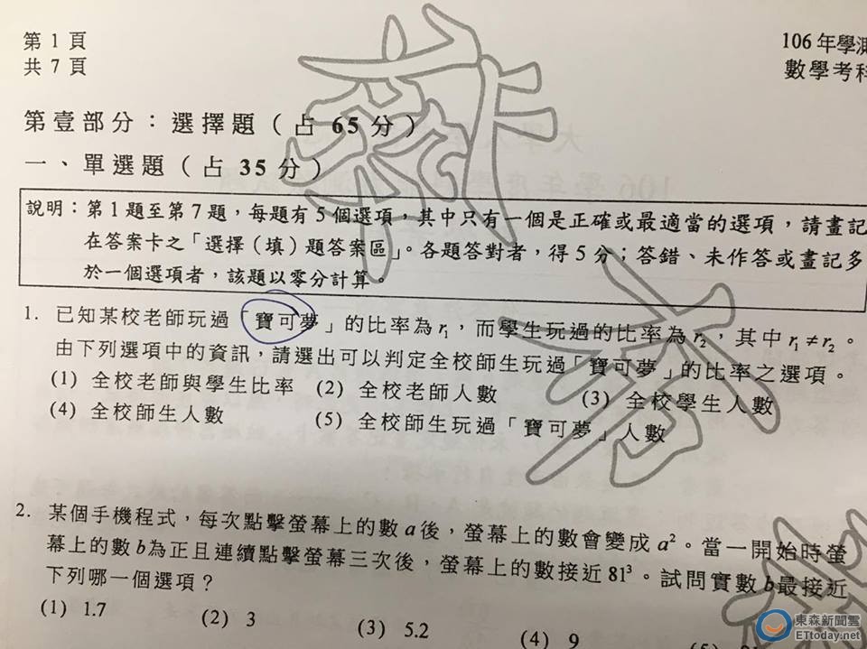 今年學測首日第二堂數學科於14時40分收卷,缺考率1.44%,試考生認為這次測驗整體「難度中」,計算量不大。而這次很夯的「寶可夢」不只國文科考題出現,就連數學也現身。