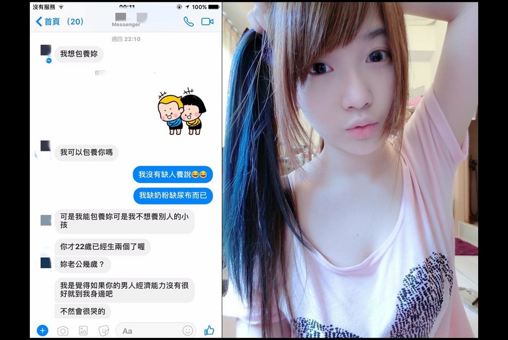 近年「包養」文化盛行,是一種以金錢、物質為基礎的互動關係,常和性交易等負面形象連結。22歲正妹網紅謝薇安臉書高達8萬7千追蹤,更不時在粉絲團放閃、曬小孩和分享產品試用心得,結果昨(19)日晚間碰上怪人騷擾,對方豪氣開出1個月4萬8千元條件,「我可以包養你嗎」?