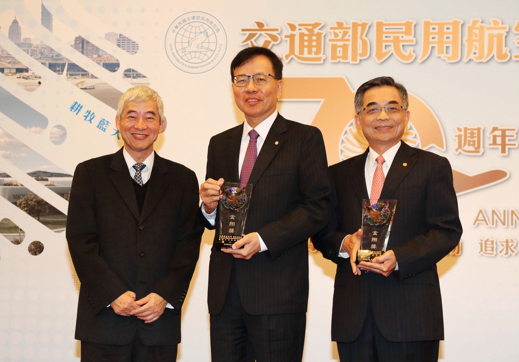 長榮航空和立榮航空分別榮獲民航局頒發105年「國際及兩岸航線組」、「國內定期航線組」金翔獎之殊榮,今(20)日在民航局由交通部長賀陳旦親自頒發,長榮航空董事長林寶水、立榮航空董事長林志忠前往領獎,此為長榮航空與立榮航空第三度同時獲得金翔獎的榮譽。