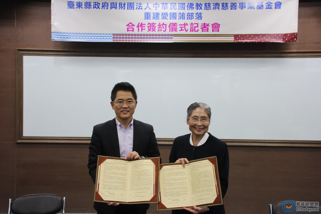 去(105)年9月因莫蘭蒂颱風,造成土石流沖入大武鄉大竹村愛國埔部落民宅,災區經專家學者會勘認定為居住堪虞地區建議進行遷建後,獲得財團法人佛教慈濟慈善基金會協助興建24棟48戶雙併鋼構綠建材家屋,並於今(20)日由縣長黃健庭與慈濟慈善基金會林碧玉副總執行長共同簽署意向書(圖/台東縣政府提供)。黃健庭代表鄉親感謝慈濟的大愛精神。