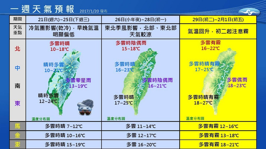 今天仍受到強烈大陸冷氣團影響, 北部和東半部白天約15至18度,一整天都會覺得冷,中南部高溫則在20至25度,日夜溫差超過10度,預計下周二才會略為回溫,至於過年年假天氣如何,從中央氣象局製作的表格可以看到,25日之前仍受到冷氣團影響,屬於乾冷,北部約在10至18度、中南部則在10至24度,溫差很大。