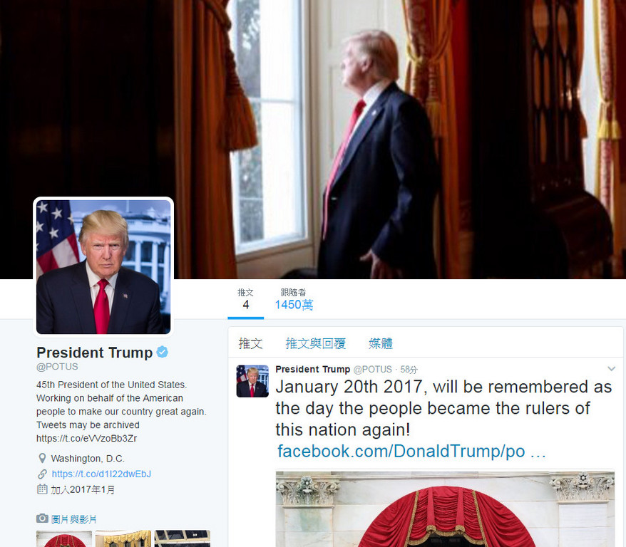 美國總統官方推特帳號「@POTUS」已移交給新任總統川普,是史上首度的「社群媒體權力移轉」,歐巴馬的推特帳號同時更新成為「@POTUS44」,且將原先的1390萬粉絲與推文,都一起轉至新帳號。但移交途中有些小差錯,在@POTUS的帳號中,還一度出現歐巴馬在2009年就職的影像,讓管理員連忙修正。