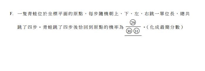數學考題選填題第F題考「一隻青蛙位於坐標平面的原點,每步隨機朝上、下、左、右跳一單位長,總共跳了四步。青蛙跳了四步後恰回到原點的機率為___。」