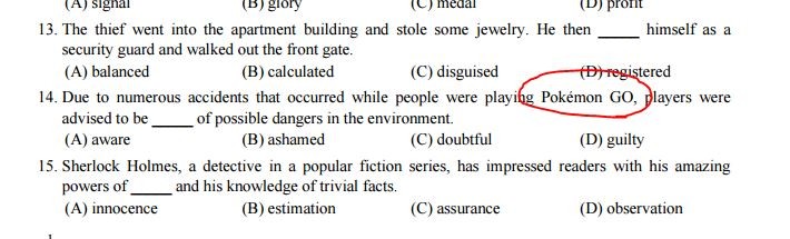 手機遊戲「寶可夢」三度出現在學測考題,國文、數學科都入題外,今天英文科第14題單字題也出現,「Due to numerous accidents that occurred while people were playing Pokémon GO, players were advised to be _____ of possible dangers in the environment.」