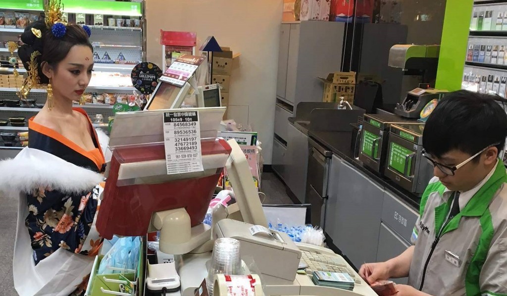 不過好笑的是,面對女神的光臨,超商店員仍是一派淡定,讓許多網友笑翻,打趣道「店員表示:身為一個專業的便利商店服務人員,什麼大風大浪我沒見過」、「媚娘是妳?」、「穿不穿越是重點嗎?重點是臉書吧」、「我比較好奇仙女買什麼」、「這時要裝酷耍帥,其實他下面硬了」;另外,也有不少人猜測,「世貿一館的全家?」、「大概電玩展附近的吧」。