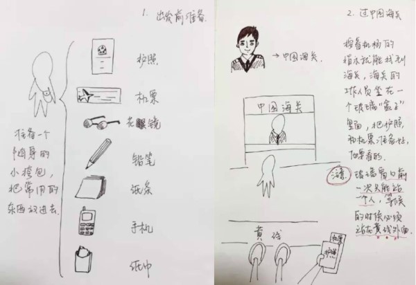 前陣子大陸媒體《環球網》報導,這對年近6旬的父母親,得知在美國的女兒生了外孫,2老想到當地探望她們。但因為他們不會英文,之前也沒有出國過的經驗,女兒擔心2老恐會在機場迷路,特別手繪了一份「出境入境攻略」,又是畫圖、又是手寫文字的提醒父母親一些注意事項。