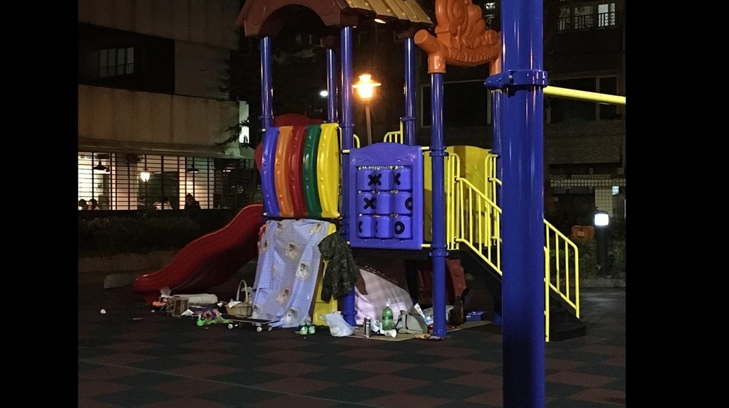 「小寶貝去公園玩,回來卻說,有人叫他們走開不要玩溜滑梯,原來是有人霸佔了!」女網友PO出的照片中,滑梯下方小空間的周圍被桌巾蓋住,自備的墊子上堆滿了包包、汽水、杯子等雜物;一旁還散落著數雙名牌運動鞋、滑板、野餐籃、外套等,一夥人就躲在小空間裡「露營」了起來。