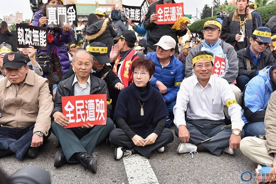 ▲洪秀柱在凱道的反年改抗議隊伍中靜坐。(圖/記者李毓康攝,下同)
