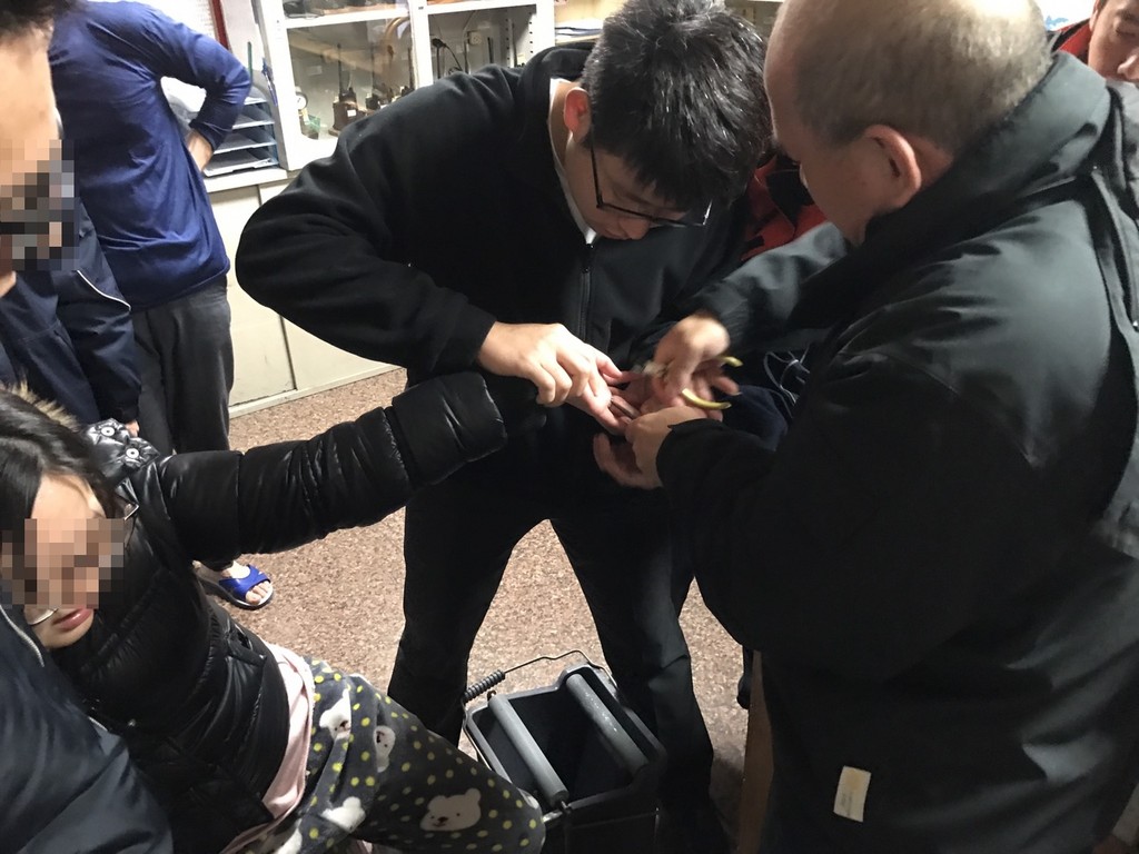 一群消防隊員有人拿食鹽水,有人拿破壞剪、斜口鉗,專注研究22歲吳姓少婦的手,因為她戴在手上的1克拉鑽戒卡住了。女子的先生站在一旁十分緊張,看著消防員左喬右喬。