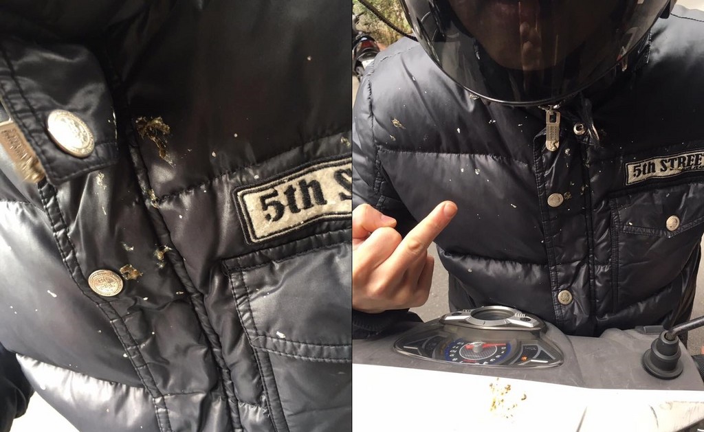 ▲不管羽絨衣或機車龍頭,全沾上鴿糞,難怪網友只能氣憤比出中指抗議。