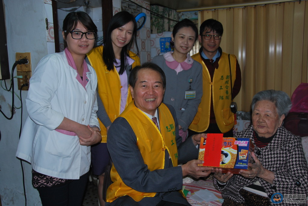 「老吾老以及人之老」,以深入社區醫療服務為目標的台南市郭綜合醫院副院長邱榮章,23日到水仙里探視社區獨居長者,關心他們的生活,噓寒問暖致贈春節慰問金外,並安排護理人員為他們量血壓,讓獨居老人備感溫暖。