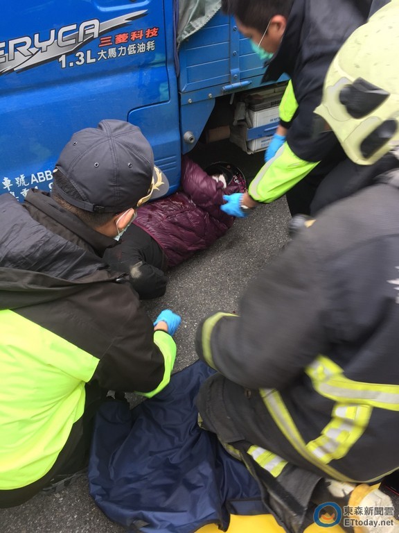 ▲高齡86歲賴姓阿婆騎車不輸少年郎搶快發生車禍,人雖摔滑至對向車道貨車底下,但奇蹟似僅受擦傷,經送醫無大礙,警方呼籲行經無號誌路口要減速。(圖/記者孫曜樟翻攝)