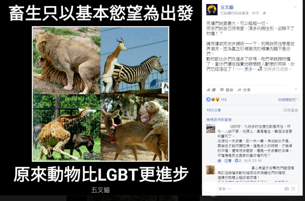 反同志專頁「五叉貓」日前PO出一張四格照片,內容盡是跨物種的不同動物,做出類似性交的動作,並在照片中寫下,畜生只以基本慾望為出發,原來動物比LGBT更進步,並有許多反同志網友的附和。