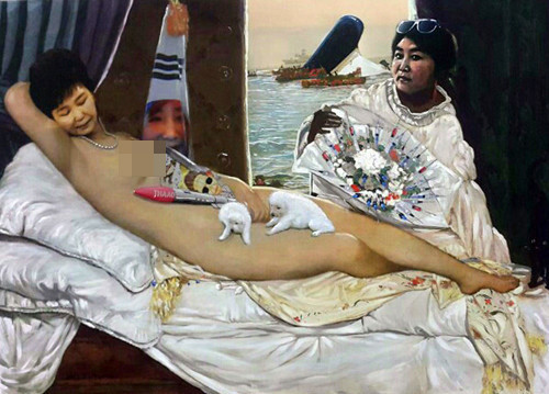 不過藝術家李九榮(Lee Koo-Young,譯音)將裸女的臉部換成朴槿惠,還另外加上崔順實、世越號、薩德,及朴的父親、前總統朴正熙的畫像。這幅合成畫被命名為「骯髒睡眠」(Dirty Sleep),諷刺朴遭指控於2014年世越號船難當天,進行醫美治療,注射針劑後昏睡,才會消失長達7小時。