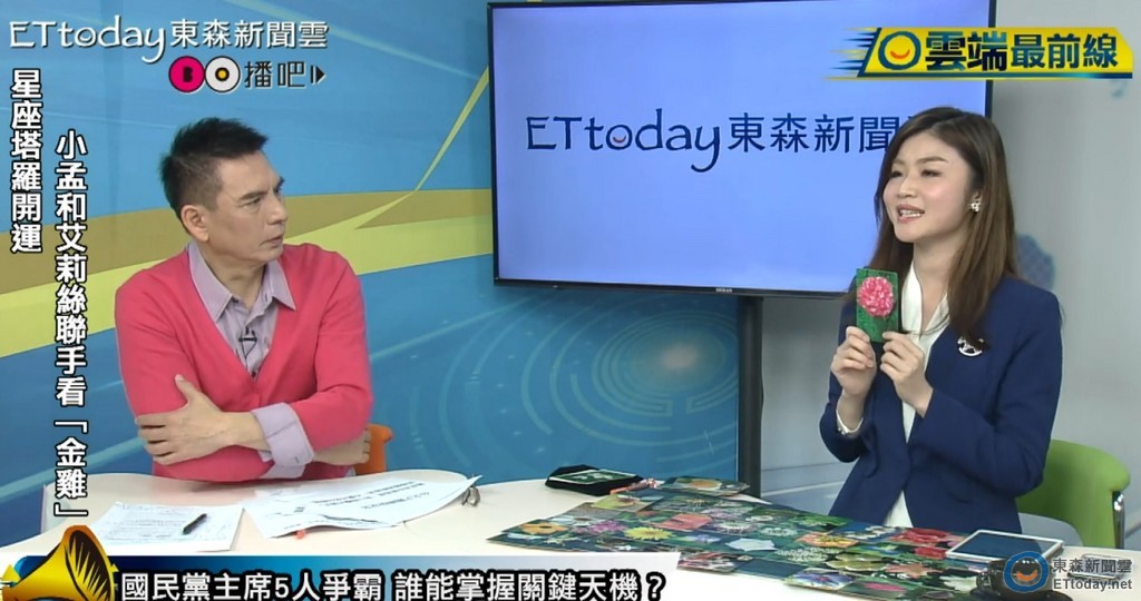 國民黨主席之戰5強爭霸!除了表態連任的黨主席洪秀柱,副主席郝龍斌、前副總統吳敦義、前北農總經理韓國瑜、請辭首席副主席的詹啟賢,先後宣布參選。塔羅牌老師艾莉絲在《ETtoday東森新聞雲》的「雲端最前線」節目中表示,國民黨目前面臨分裂和整合的狀態,有重生的機會,最後也會成功。