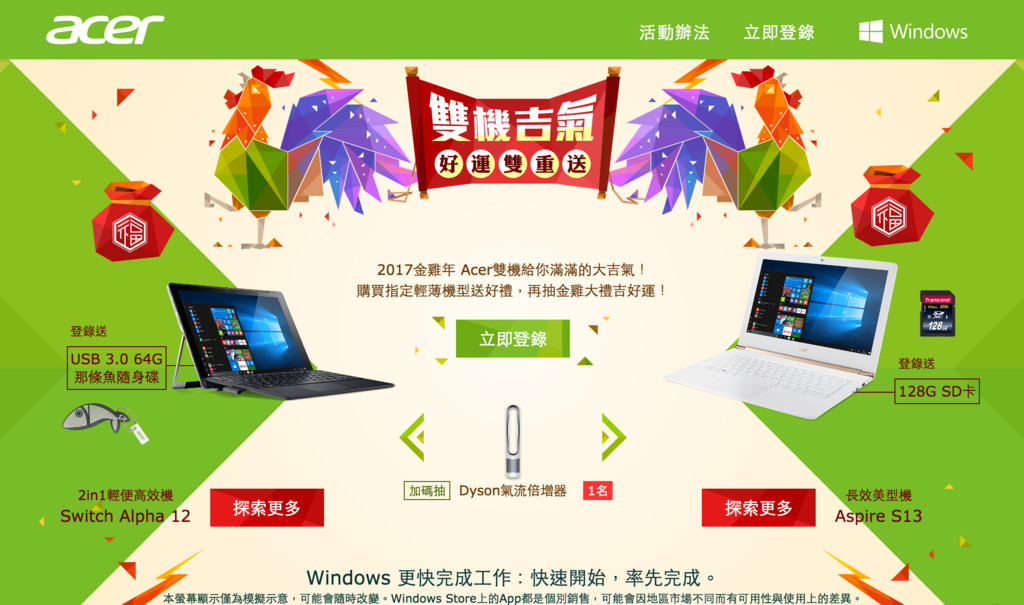 為慶祝春節假期,Acer 宏碁也推出「雙機吉氣 好運雙重抽」活動,只要購買 Aspire S13、Switch Alpha 12 系列之指定機型,上網登錄後能獲得實用贈品之餘,還能加碼抽 Dyson 氣流倍增器、掃地機器人等多項好禮。