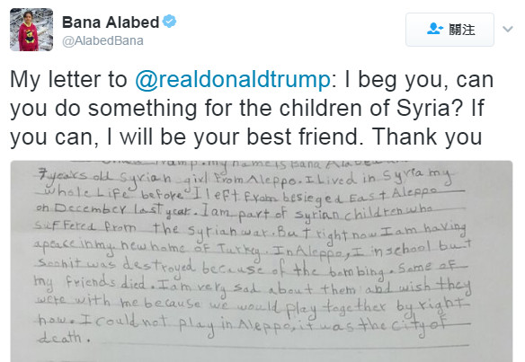 7歲敘利亞女童芭娜(Bana Alabed)與母親法蒂瑪,藉由推特記錄阿勒坡當地無情的戰火生活,引起世界關注。日前她寫下一封公開信要給新任美國總統川普,「我知道你將是美國總統,你能救救敘利亞的孩子和人民嗎?」懇求川普能夠幫助和她一樣深陷戰亂的人們。