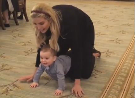 美國新任第一千金伊凡卡(Ivanka Trump),常常在社群網路放閃曬幸福,她在臉書上發表自己最小的孩子西奧多(Theodore Kushner),在白宮地毯上學爬的影片,只見未滿1歲的西奧多,在地毯上奮力前進,而伊凡卡也十分自在地席地而坐、陪孩子學習。