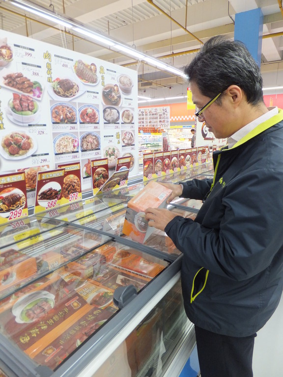 ▲新竹市消保官劉興振前往各大量販店查驗年菜活動廣告與包裝。
