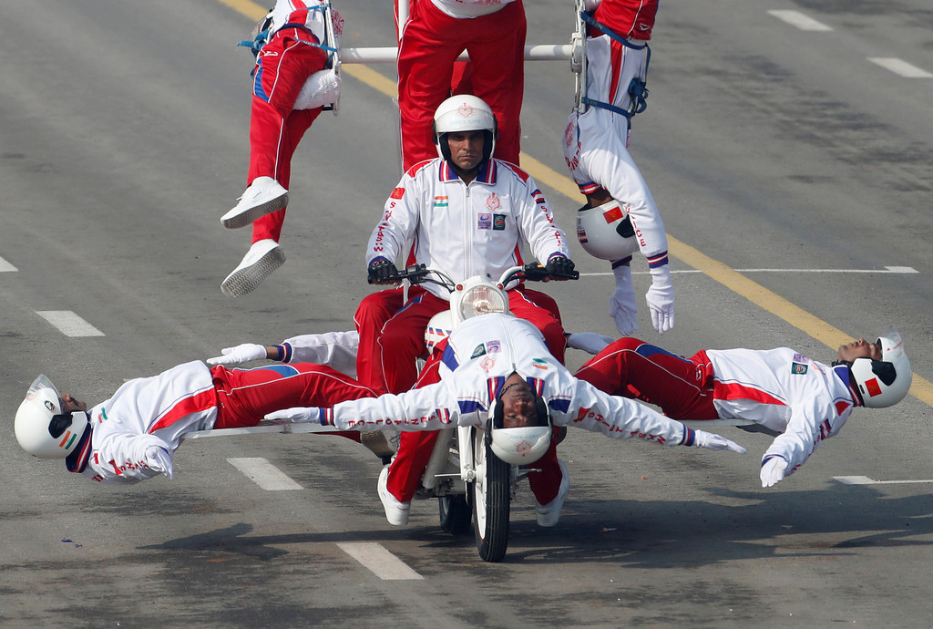印度1月26日在首都新德里舉行「共和國日」閱兵式,慶祝獨立68周年。印度總理莫迪當天上午也蒞臨「國王大道」,看著陸、海、空軍展示新式武器,以及最負盛名的「摩托車特技方陣」,隨著人肉鐵塔、人肉金字塔、人肉風車輪番上陣,現場氣氛也被炒到最高潮!