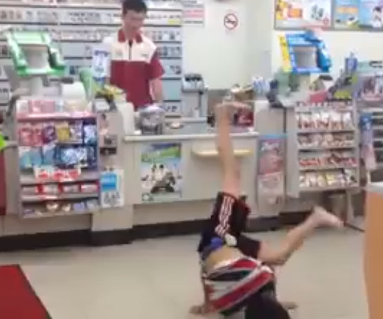 影片中可以看到,小朋友跟店員說「看我!打酒拳」,接著就到櫃檯前的地板表演,街舞「大風車」的動作不斷旋轉,最後不忘擺出帥氣姿勢,結束時問「厲害嗎?」直到店員鼓掌才小跑步離開。