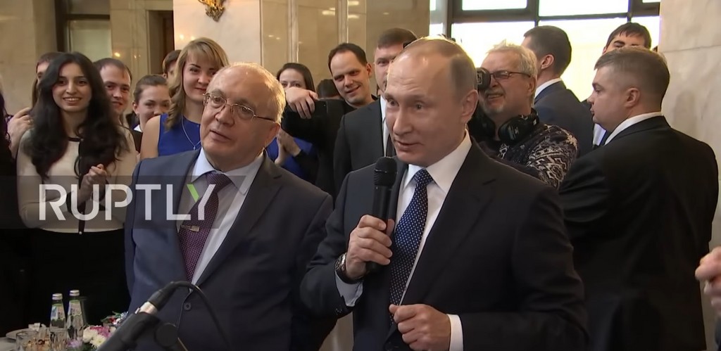 普丁曾承諾為莫斯科大學提供柔道班,並在25日抵達活動現場,與學生們一同慶祝。一名學生表示,想要送給普丁黑帶當作信物,「因為你是柔道好手。」學生隨即拿起吉他獻唱歌曲,但或許是太緊張的緣故,歌詞幾乎都「落拍」,這時普丁一個「神救援」,要求現場的人幫忙打節拍,並順手拿起麥克風「開嗓」。雖然僅唱短短幾句,但仍贏得學生熱烈鼓掌。