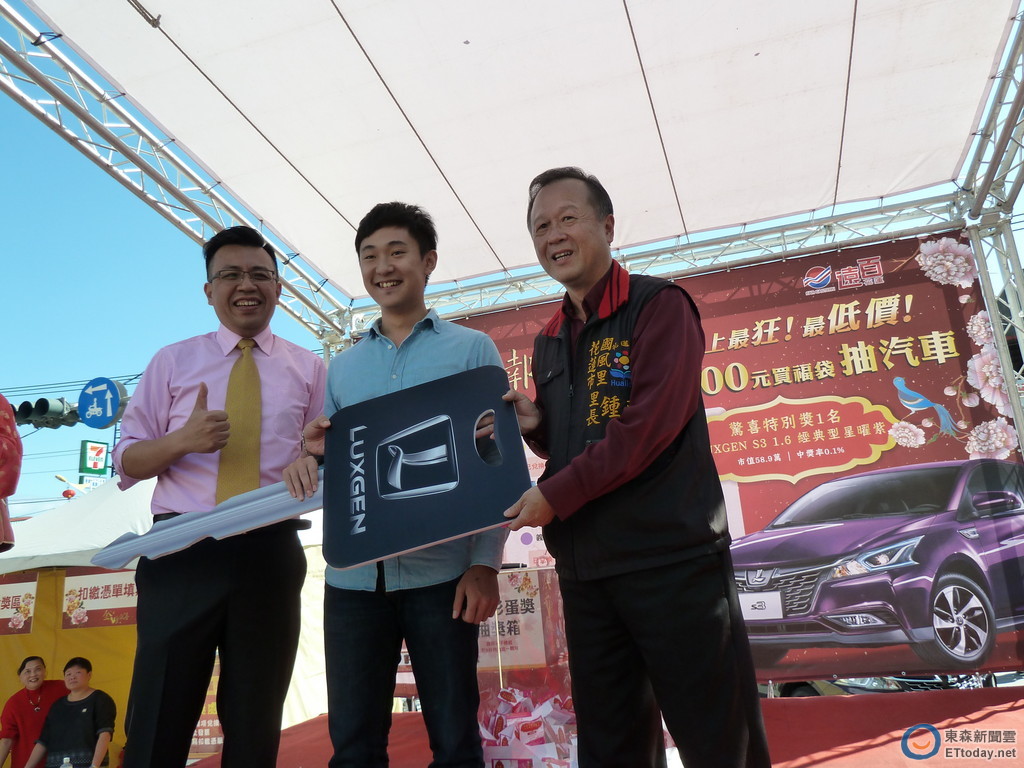 ▲花蓮遠東百貨新春福袋特奬LUXGEN S3 汽車,由台北返鄉過年的23歲科技人開走。(圖/記者王兆麟攝 下同)