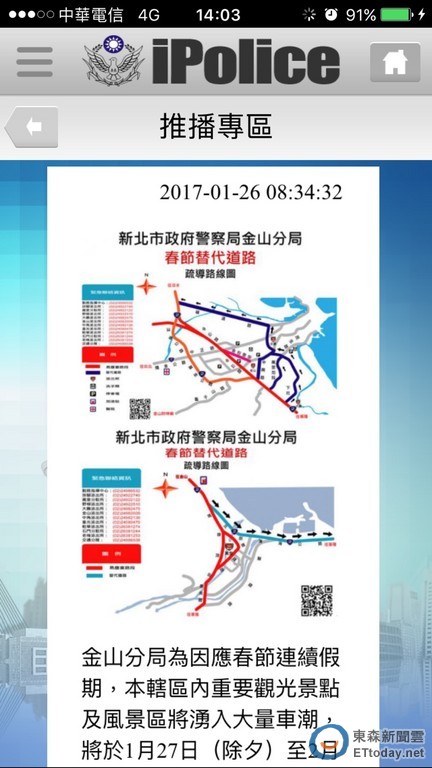 ▲新春假期新北各地區活動多,為免塞車之苦警呼籲民眾多搭大眾交通運輸工具前往,不然也可多利用新北警開發的i-police app掌握交通狀況。(圖/記者孫曜樟翻攝)