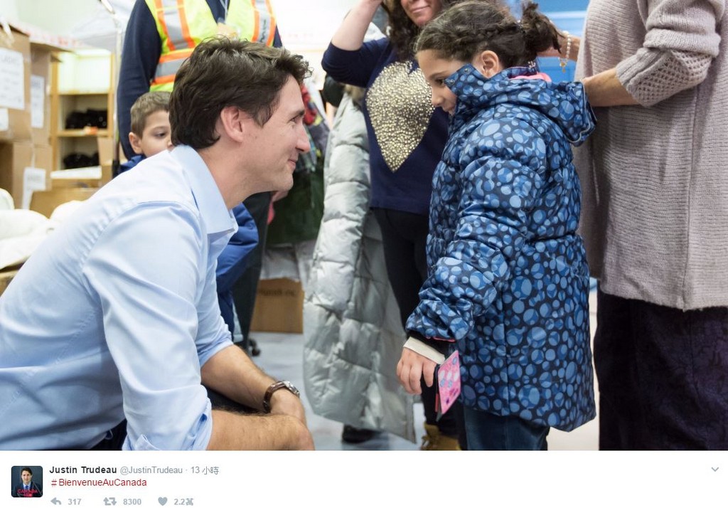 美國總統川普於27日簽署的新移民政策引發各界抗議,鄰國加拿大總理賈斯汀‧杜魯道(Justin Trudeau)卻於敏感時刻在推特上發文表示,「對於那些逃離迫害、恐怖和戰爭的人,加拿大都會歡迎你,不論你的信仰如何。」隔13分鐘他再度貼上2015年底上任時,親自到機場迎接敘利亞難民入境的照片,並加註「歡迎來加拿大。」立刻湧入51.1萬人按讚、30.7萬人轉載。