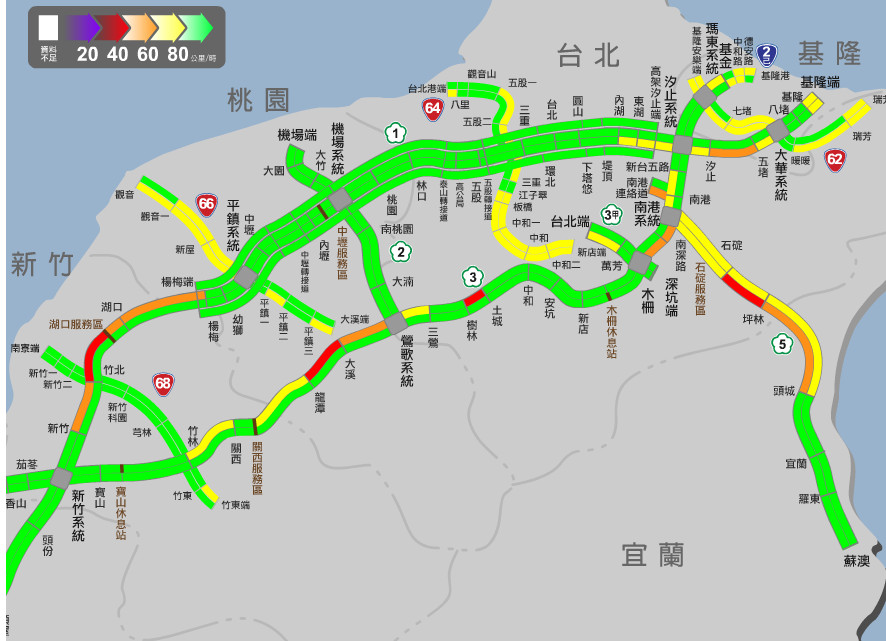 目前國道1號,南下彰化到埔鹽系統速度逐漸緩放,時速約在40~60公里;南下湖口休息區一路至新竹時速僅約30~40公里;國道3號和美南下至彰化系統,更出現時數僅30公里左右;鶯歌系統三鶯至龍潭時速維持約30公里。
