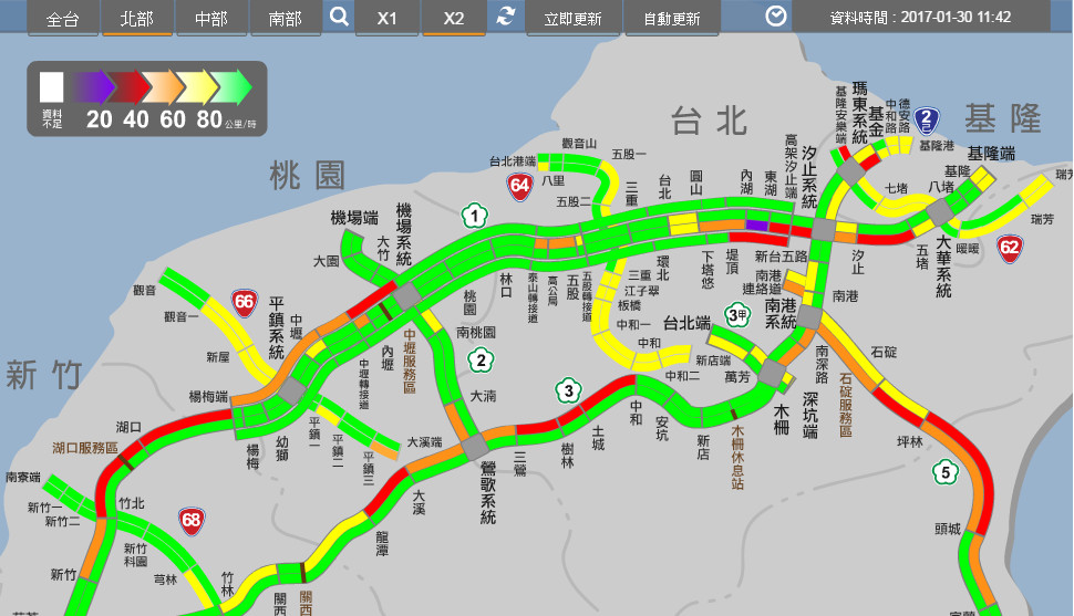 國道1號雲林系統一路至台中車潮湧現,時速約在40~60公里;新竹北上至機場系統車速逐漸漸慢;內湖至汐止甚至出現紫爆的的情形;國道3號鶯歌系統北上至中和車流量大,時速僅30公里;國道5號南港系統到宜蘭時速維持在40~60公里,隧道入口更回堵7公里。