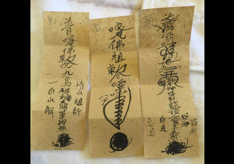 第一張圖片中間的符咒應該是我們常常看到的太歲符,上面有「唵佛敕令」,乃是普唵派 的太歲符。普唵祖師常常跟清水祖師搞混,兩個人不一樣唷!普唵是紅臉!