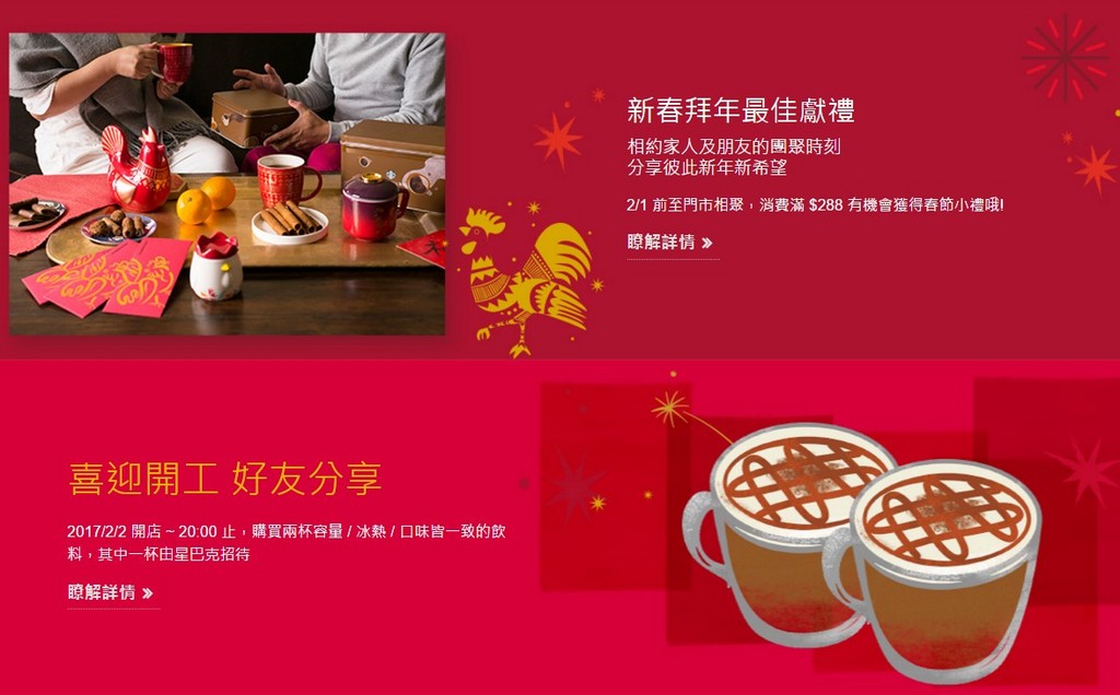 星巴克2月2日推出開工好友分享日,開店起至晚間8點,凡購買2杯容量、冰熱、口味皆一致的飲料,其中一杯由星巴克招待,但每人每次最多買二送二,飲料限當場一次領取,不適用於外賣外送預定。
