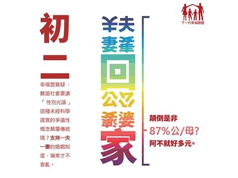反同婚的「下一代幸福聯盟」連續在春節假期PO文,除了初二寫到「初二回娘家,到底回誰家,誰是公公誰是婆婆,男男和女女傻傻都分不清」外;在春節尾聲也呼籲民眾力阻同婚法案,「現在政府推行同性婚姻又兇又急,且不廣開公聽會」;1日開工前也指出,「學校開學了,但是學校課本在教什麼,你知道嗎?」