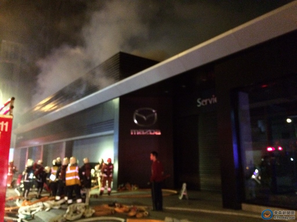 新北市消防局119勤務指揮中心是在今日凌晨2時24分接獲報案,指稱中和市中正路上馬自達汽車服務展示廠有白煙冒出,警消出動約25輛消防水箱車、救護車3輛到場,由於當時展場沒人留守,警消立即用破壞工具將鐵門鋸開,進入火場灌救。