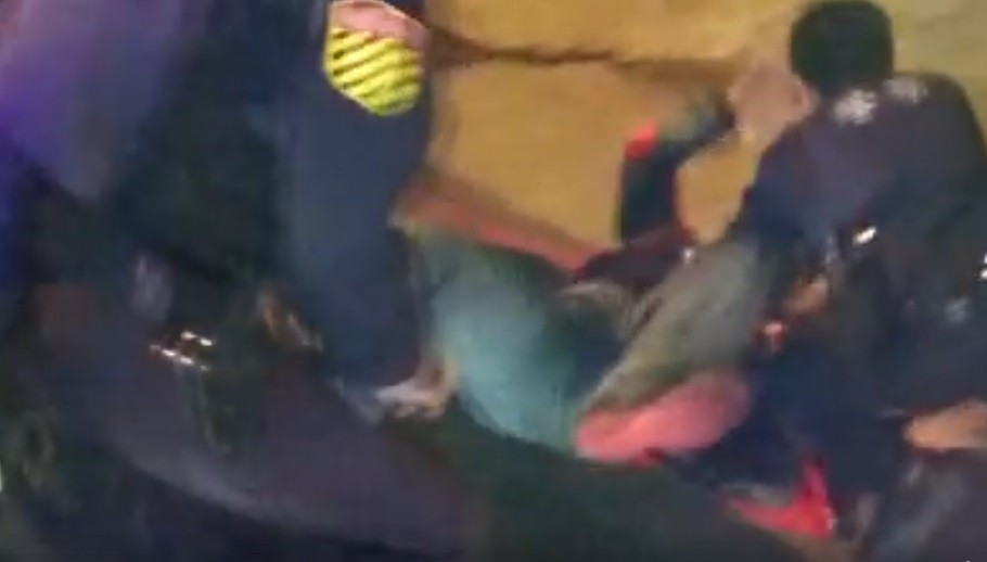 影片中,態度相當配合的婦人在執行酒測吹氣時,酒醉的紅衣男在旁不斷挑釁員警,警方一開始還無奈勸說「拜託,你不要這樣好不好啦!」但男子借酒壯膽,仍是毫不退縮,最後還怒嗆「幹X娘!」員警一聽臉色立刻大變,「你剛剛說什麼?」旋即出手勒住男子脖子將他放倒在地。
