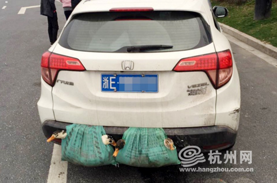 杭州青山湖收費站3日出現難得奇景,有駕駛將2袋活鴨裝袋吊在車後,行駛在杭徽高速公路往杭州方向,引起後方車輛分心追撞。這名駕駛的車輛被目擊後被拍照上傳網路,被網友戲稱為「雙渦輪增鴨」。