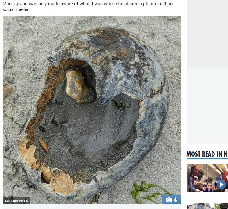 57歲的英國藝術家海倫(Helen Frost)日前在沙灘上遛狗時,意外發現一個白色易碎的「大貝殼」,她隨後將照片上傳到臉書,並發現驚人的事實。原來這個大貝殼其實是一個年老的頭蓋骨,專家表示,這個遺骸很有可能是屬於百年前的船難死者,他的遺體當時被埋葬在海灘上。