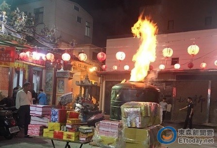 ▲台南市全台白龍庵安慶堂「五瘟宮」化補財金之金爐的火苗,竟然化成一條一飛沖天的「金火龍」,讓現場信眾嘖嘖稱奇。(圖/記者林悅翻攝)